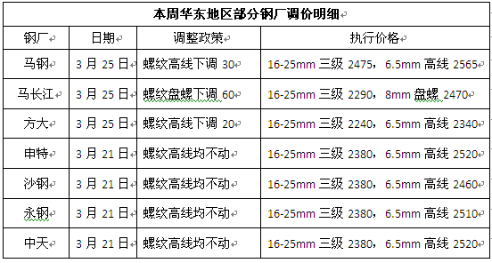 點(diǎn)評(píng):隨著原料和成品材價(jià)格逐步走高,鋼廠價(jià)格政策連續(xù)上調(diào)或保持堅(jiān)挺。其中21日沙永中等鋼廠出臺(tái)下旬價(jià)格政策,均對(duì)價(jià)格政策維持不動(dòng),調(diào)后沙鋼三級(jí)螺紋價(jià)格為2380元/噸,高線價(jià)格為2460元/噸。21日申特對(duì)價(jià)格政策保持不動(dòng),調(diào)后三級(jí)螺紋價(jià)格為2380元/噸,高線價(jià)格為2520元/噸。25日方大特鋼對(duì)南昌地區(qū)建材價(jià)格下調(diào)20元/噸,調(diào)后三級(jí)螺紋價(jià)格為2240元/噸,高線價(jià)格為2340元/噸。25日安徽長(zhǎng)江對(duì)合肥地區(qū)建材價(jià)格下調(diào)60元/噸,調(diào)后三級(jí)螺價(jià)格為2290元/噸,盤螺價(jià)格為2470元/噸。25日馬鋼對(duì)合肥地區(qū)建材價(jià)格下調(diào)30元/噸,調(diào)后三級(jí)螺紋價(jià)格為2475元/噸,高線價(jià)格為2565元/噸。另悉,中天鋼廠于3月中旬對(duì)一條螺紋鋼生產(chǎn)線進(jìn)行檢修,檢修結(jié)束時(shí)間未定,影響產(chǎn)量0.2萬(wàn)噸/天。