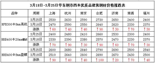 點(diǎn)評(píng):春風(fēng)拂面,桃紅柳綠,三月氣溫有助終端需求的釋放。然上周末開始,南方迎來持續(xù)強(qiáng)降雨,對(duì)江西贛南和福建南部影響較大。近日黑色系期貨走勢(shì)強(qiáng)勁,其中3月17日至21日,螺紋期貨成交量不足800萬(wàn)手快速增至2000萬(wàn)手,期螺強(qiáng)勁極大鼓舞鋼市信心,加上部分鋼廠連續(xù)調(diào)價(jià)助漲,本周市場(chǎng)行情普遍上漲。周四至周五,期貨市場(chǎng)出現(xiàn)暴漲暴跌模式,終端需求相對(duì)疲軟,各地鋼價(jià)出現(xiàn)止?jié)q盤整態(tài)勢(shì)。本周合肥鋼價(jià)繼續(xù)瘋狂,周一早盤猛漲150元/噸,周二鋼市又大跌100元/噸,截至周五,合肥優(yōu)質(zhì)品大螺紋報(bào)價(jià)2660元/噸,遙遙領(lǐng)先華東其它鋼市報(bào)價(jià)。截至周五早盤,華東七大鋼市高線平均漲跌幅較上周上漲47.14元/噸,螺紋平均漲跌幅較上周上漲62.86元/噸,盤螺平均漲跌幅較上周上漲57.14元/噸。