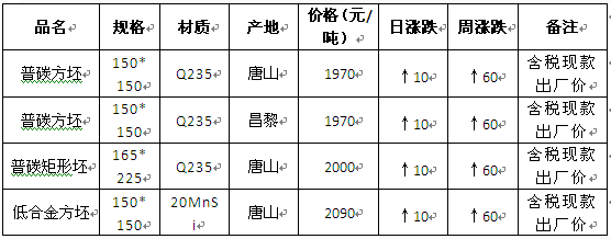 新干線訊:午盤,唐山普碳方坯報(bào)價(jià)上漲10元/噸,現(xiàn)昌黎宏興、唐山國(guó)義、興隆、中鐵榮信現(xiàn)金含稅出廠價(jià)1970元/噸;普碳矩形坯現(xiàn)金含稅價(jià)為2000元/噸,低合金方坯20Mnsi現(xiàn)金含稅價(jià)2090元/噸。