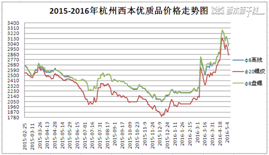 (一)下圖為2015年2月25日-2016年5月6日杭州西本優(yōu)質(zhì)品市場價格走勢圖: