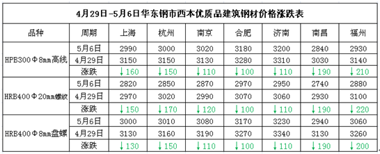 點(diǎn)評:鋼坯連續(xù)大跌,期貨連續(xù)跳水,終端縮減采購,鋼價大幅回落。截至周五,杭州鋼市沙鋼螺紋與出廠價倒掛幅度達(dá)400元/噸,多數(shù)代理商無奈表示,鋼市又要回到“解放前”,中旬鋼廠不可能補(bǔ)到位,“苦水”還是貿(mào)易商獨(dú)自承受。從鋼廠調(diào)價來看,1日沙永中等鋼廠對5月上旬價格政策統(tǒng)漲30元/噸,調(diào)后沙鋼三級螺紋價格為3090元/噸,高線價格為3160元/噸;永鋼三級螺3090元/噸,高線價格為3210元/噸;中天三級螺3090元/噸,高線價格為3220元/噸;6日福建三鋼對上旬價格大幅下調(diào)210元/噸,調(diào)后抗震三級螺2850元/噸,線材價格為2880元/噸;6日方大特鋼對建筑鋼材價格下調(diào)70元/噸,調(diào)后三級螺2660元/噸,線材價格2760元/噸;6馬鋼對建材價格下調(diào)50元/噸,調(diào)后三級螺2825元/噸,線材價格2945元/噸。