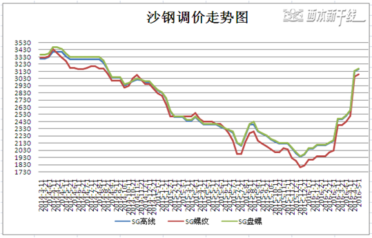 (二)下圖為2015年3月11日-2016年5月1日沙鋼調(diào)價走勢圖: