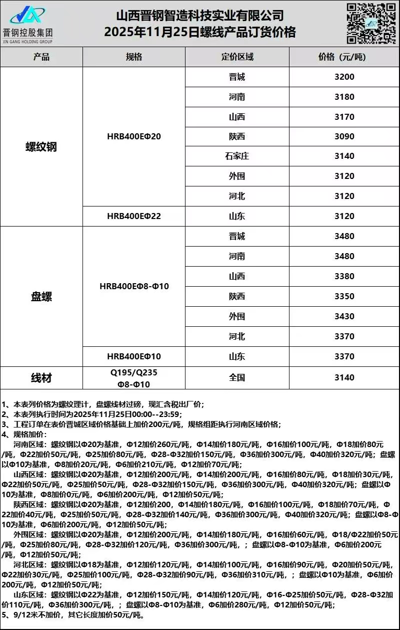 11月25日山西晉鋼建筑鋼材訂貨價格