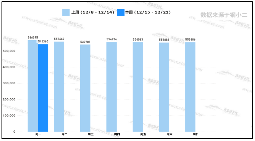 據(jù)鋼小二平臺樣本數(shù)據(jù),12月15日建筑鋼材社會庫存量為541,360噸,較上周五庫存量下降2.2%。