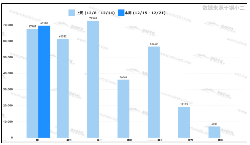 據(jù)鋼小二平臺樣本數(shù)據(jù),12月15日采樣全國工程需求量為59,588噸,環(huán)比上周五交易量增加22%。