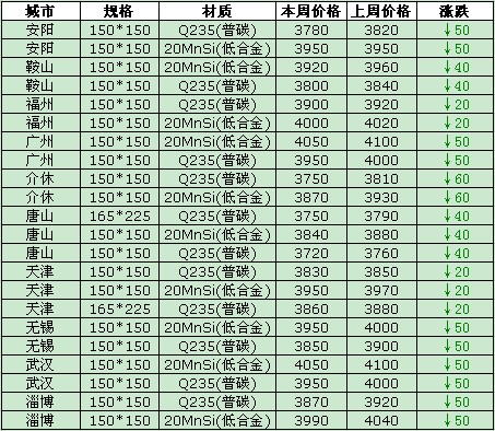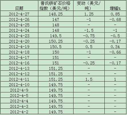 中南地區(qū)鐵精粉價(jià)格暫穩(wěn):目前廣東懷集65%鐵精粉干基含稅出廠主流價(jià)位在1030元/噸;湖北大冶63%鐵精粉干基含稅出廠主流價(jià)格在1050元/噸。 下表為本周部分地區(qū)市場(chǎng)主流成交價(jià)格: ? 以下為2012年以來(lái)遼寧地區(qū)濕基65-66品位鐵精粉市場(chǎng)行情走勢(shì)圖: ? 鋼廠采購(gòu)價(jià)格:本周河北地區(qū)鋼廠采購(gòu)價(jià)部分小幅下調(diào),唐山、遷安地區(qū)鋼廠66%鐵精粉到廠價(jià)格下調(diào)1220-1230元/噸;遷西、遵化鋼廠66%鐵精粉采購(gòu)價(jià)格執(zhí)行1200元/噸,60%粗粉執(zhí)行1020元/噸。邯邢局66%鐵精粉采購(gòu)價(jià)格下調(diào)20至1105元/噸,堿性干基不含稅,遼寧凌鋼鐵粉采購(gòu)價(jià)下調(diào)10,調(diào)整后66%酸粉干基含稅承兌到廠基價(jià)1080,保量加價(jià)。 普氏指數(shù)趨勢(shì): 本周普氏指數(shù)先抑后揚(yáng),現(xiàn)普氏指數(shù)148.5美元/噸,累積比上周跌1.25美元/噸,跌幅1.33%。 下表為4月份普氏指數(shù)變動(dòng)表: ? 普氏走勢(shì)圖: ? 說(shuō)明:普氏鐵礦石價(jià)格指數(shù)對(duì)現(xiàn)貨市場(chǎng)出售并通過(guò)海路進(jìn)口至中國(guó)的鐵礦石進(jìn)行每日交易價(jià)格評(píng)估,該基準(zhǔn)估價(jià)基于含鐵量為62%的標(biāo)準(zhǔn)鐵礦石。 庫(kù)存: 截至4月23日,中國(guó)港口鐵礦石庫(kù)存(沿海25港口)為9711萬(wàn)噸,較上周(4月9日-4月13日,下同)增加82萬(wàn)噸,環(huán)比上升0.85%。 港口庫(kù)存延續(xù)上周升勢(shì),但總量仍處于年內(nèi)較低水平。據(jù)了解,印度西岸下月或?qū)⒁蚣竟?jié)影響停止發(fā)貨,本月發(fā)貨量有所增加。同時(shí),上周巴西和澳大利亞發(fā)貨量也有所增加,其中西澳港口大部分增量發(fā)往中國(guó)市場(chǎng),短期國(guó)內(nèi)港口鐵礦石庫(kù)存仍將延續(xù)前期漲勢(shì)。 現(xiàn)進(jìn)口礦現(xiàn)貨市場(chǎng)基本保持穩(wěn)定,后期受鋼材市場(chǎng)價(jià)格小幅下跌影響,成交情況不佳,部分地區(qū)低品位印粉報(bào)價(jià)小幅回落PB粉在146-148美元/噸,63%巴粗143-145美元/噸,53/52%印粉100-102美元/噸。港口現(xiàn)貨方面,PB粉主流1000-1020元/噸,楊迪粉920-940元/噸,63%巴粗990-1000元/噸,54%印粉730-740元/噸。 【鋼坯】本周西本鋼坯指數(shù)4050點(diǎn)。 本周全國(guó)大部地區(qū)鋼坯價(jià)格普遍下跌,比上周跌幅增大,跌幅20-60元/噸不等,成交不佳。 本周唐山鋼坯價(jià)格下跌,成交偏淡。延續(xù)上周周末跌勢(shì),本周初普碳150坯3720元/噸,165矩形坯3750元/噸,20MnSi坯3840元/噸 含稅現(xiàn)款出廠價(jià),累計(jì)跌40元/噸。之后一直以弱穩(wěn)運(yùn)行。鋼坯價(jià)格小幅下跌主要是產(chǎn)能與需求矛盾,初步統(tǒng)計(jì)唐山目前日產(chǎn)鋼坯超過(guò)10萬(wàn)噸,但日需求量只在8.5萬(wàn)噸左右鋼坯供應(yīng)量較大,在下游需求未有明顯好轉(zhuǎn)的情況下,多數(shù)市場(chǎng)人士對(duì)近期市場(chǎng)仍不看好。從宏觀政策方面沒(méi)有利好因素,國(guó)家對(duì)鋼鐵及房地產(chǎn)行業(yè)沒(méi)有放松。據(jù)商家反映目前南方資金比較緊缺,可能對(duì)市場(chǎng)造成一定影響。預(yù)計(jì)后市以弱勢(shì)盤(pán)整運(yùn)行。 本周江蘇地區(qū)鋼坯價(jià)格大幅下跌,采購(gòu)意愿不強(qiáng),累計(jì)跌幅在120元/噸左右。現(xiàn)Q235坯廠家主流含稅出廠報(bào)價(jià)在3850元/噸,20MnSi坯主流報(bào)3950元/噸。臨近月末,部分廠家資金較為緊張,加上建筑鋼材價(jià)格連續(xù)下跌,鋼坯企業(yè)訂單減少,心態(tài)不穩(wěn),持續(xù)下調(diào)價(jià)格。前期交貨期多在1個(gè)月,近日明顯縮短,目前鋼廠訂單交貨期在15天至20天?!?/span>當(dāng)前市場(chǎng)處于下跌的態(tài)勢(shì),采購(gòu)方比較謹(jǐn)慎,輕易不訂貨。預(yù)計(jì)后市仍將以弱穩(wěn)運(yùn)行,下跌空間不大。 武安地區(qū)方坯市場(chǎng)價(jià)格繼續(xù)走低,成交差,當(dāng)?shù)卮蟛糠种髁鲌?bào)價(jià)Q235普碳坯3820元/噸,20MnSi報(bào)價(jià)3940元/噸,累計(jì)比上周跌20元/噸。成品材市場(chǎng)低迷,唐山地區(qū)鋼坯價(jià)格頻繁下跌,這些都不利因素直接影響著武安方坯價(jià)格。下游采購(gòu)方更是采取觀望態(tài)度,對(duì)于后市多數(shù)商家仍不抱信心,預(yù)計(jì)將繼續(xù)弱穩(wěn)下調(diào)態(tài)勢(shì)運(yùn)行。