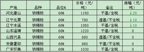 本周遼寧鐵精粉弱勢(shì)下跌,跌幅在10-20元/噸。而市場(chǎng)心態(tài)比較悲觀。建平65%-66%鐵精粉濕基不含稅出廠價(jià)在810元/噸,北票65%-66%鐵精粉濕基不含稅出廠價(jià)在790元/噸。遼陽(yáng)65%-65.5%鐵精粉濕基不含稅出廠價(jià)在800元/噸。本溪65%-65.5%鐵精粉濕基不含稅出廠價(jià)在810元/噸,受近期鋼材市場(chǎng)弱勢(shì)運(yùn)行,河北地區(qū)部分鋼廠小幅下調(diào)采購(gòu)價(jià)格的影響,當(dāng)?shù)厣碳倚判氖艽欤瑢?duì)后期市場(chǎng)期望度不高,資金緊張的廠商出貨較為積極。預(yù)計(jì)短期內(nèi)鐵精粉市場(chǎng)以穩(wěn)為主。
