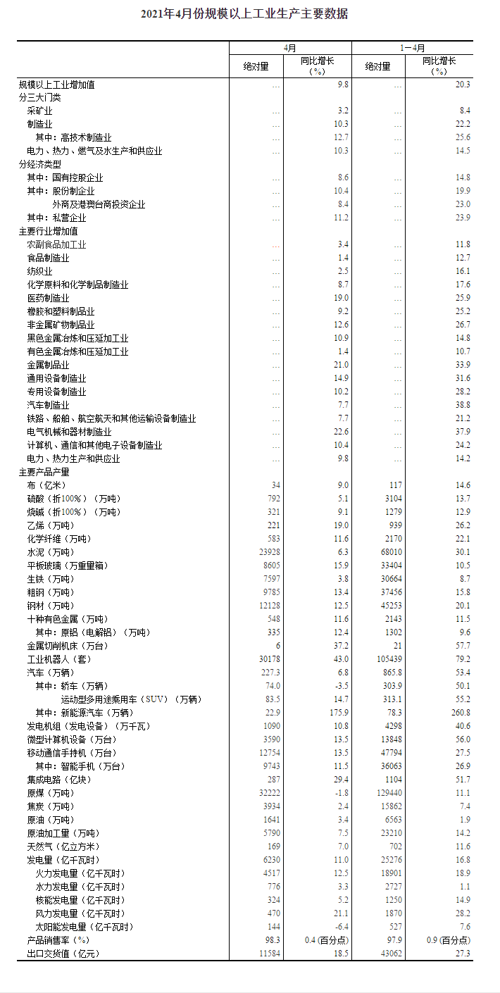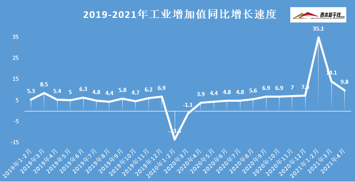 2021年4月規(guī)模以上工業(yè)增加值增長9.8%,兩年平均增長6.8%