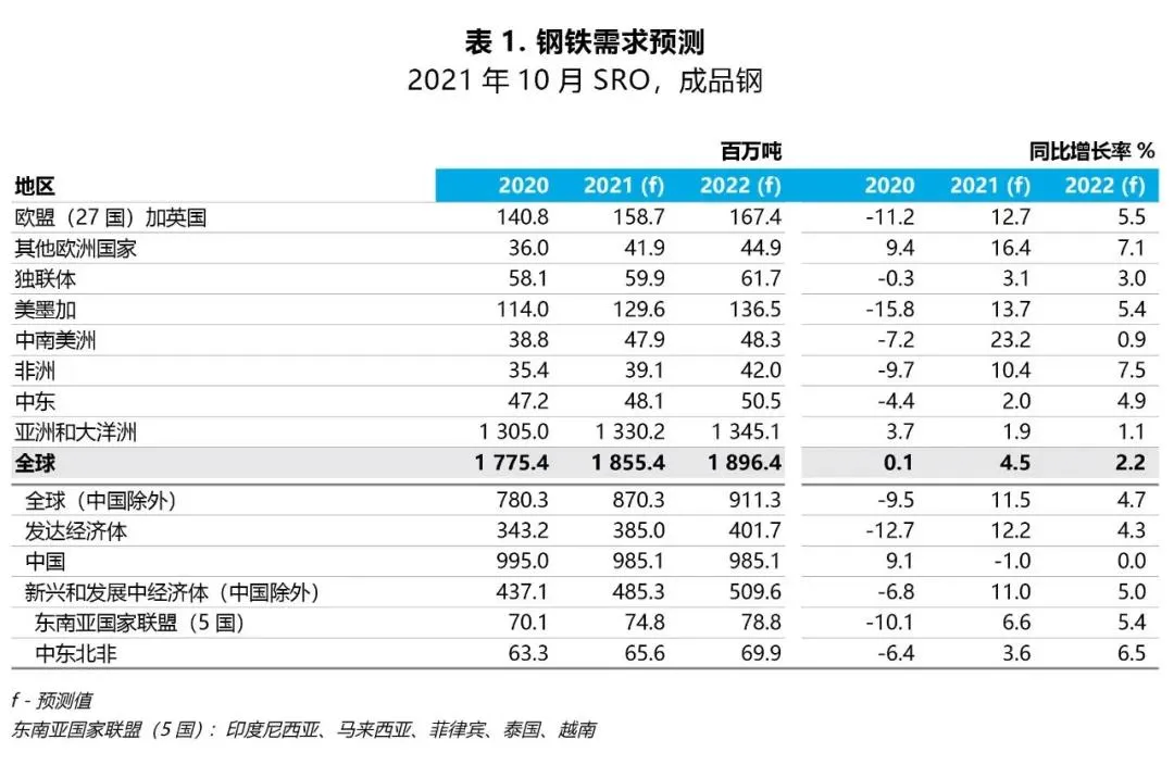 對于發(fā)達(dá)經(jīng)濟(jì)體的需求,2022年,隨著供應(yīng)鏈瓶頸的減少、抑制需求的持續(xù)釋放以及企業(yè)和消費(fèi)者信心的提升,復(fù)蘇態(tài)勢將更加有力。發(fā)達(dá)經(jīng)濟(jì)體的鋼鐵需求量繼2020年下降12.7%后,將在2021年增長12.2%,在2022年繼續(xù)增長4.3%,達(dá)到疫情之前的水平。