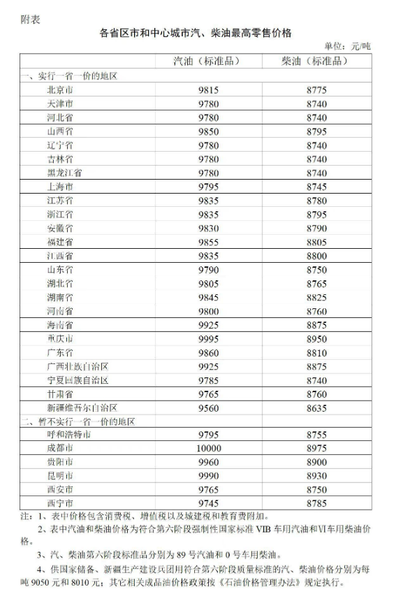 根據(jù)近期國(guó)際市場(chǎng)油價(jià)變化情況,按照現(xiàn)行成品油價(jià)格形成機(jī)制,自2023年4月17日24時(shí)起,國(guó)內(nèi)汽、柴油價(jià)格(標(biāo)準(zhǔn)品,下同)每噸分別提高550元和525元。調(diào)整后,各?。▍^(qū)、市)和中心城市汽、柴油最高零售價(jià)格見附表。相關(guān)價(jià)格聯(lián)動(dòng)及補(bǔ)貼政策按現(xiàn)行規(guī)定執(zhí)行。