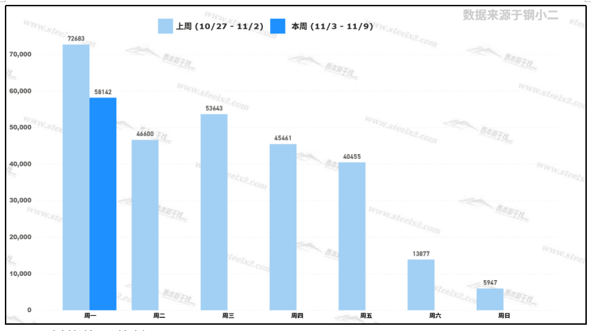 據(jù)鋼小二平臺樣本數(shù)據(jù),11月3日采樣全國工程需求量為58,142噸,較上周一交易日下降20%。