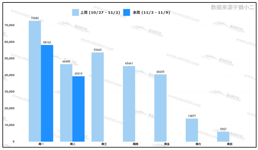 據(jù)鋼小二平臺樣本數(shù)據(jù),11月4日采樣全國工程需求量為39,319噸,較上周一交易日下降32%。