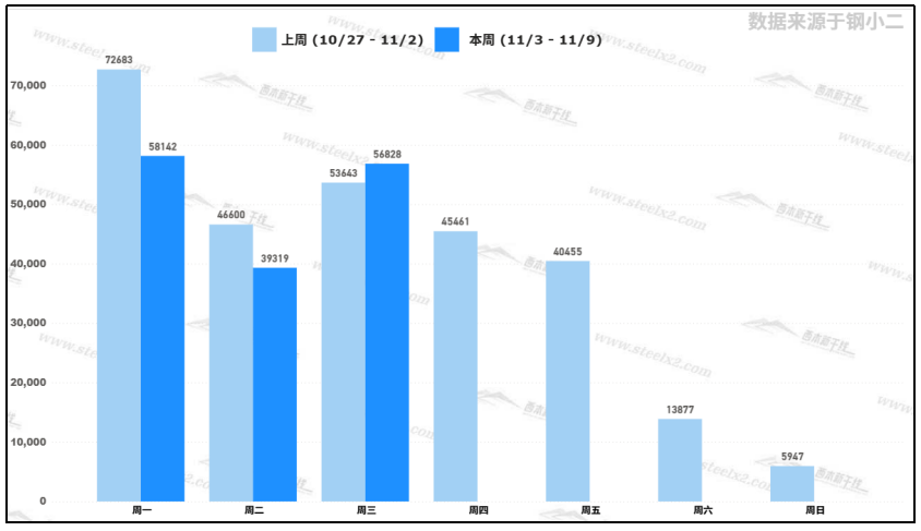據(jù)鋼小二平臺樣本數(shù)據(jù),11月5日采樣全國工程需求量為56,828噸,環(huán)比上個交易日增加40%。