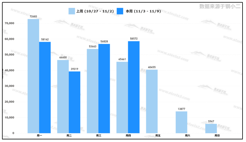 據(jù)鋼小二平臺樣本數(shù)據(jù),11月6日采樣全國工程需求量為58,572噸,環(huán)比上個交易日微增3%。