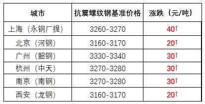 截至午間,國(guó)內(nèi)部分市場(chǎng)螺紋鋼(抗震)基價(jià)如下:上海市場(chǎng)3260-3270元/噸;北京市場(chǎng)3160-3170元/噸;廣州市場(chǎng)3330-3340元/噸;杭州市場(chǎng)3270-3280元/噸;南京市場(chǎng)3270-3280元/噸;西安市場(chǎng)3160-3170元/噸。環(huán)比來看,截至上午收盤,全國(guó)主要市場(chǎng)一線品牌價(jià)格普漲。