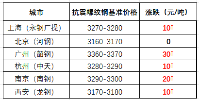 截至午間,國內(nèi)部分市場螺紋鋼(抗震)基價如下:上海市場3280-3280元/噸;北京市場3160-3170元/噸;廣州市場3360-3370元/噸;杭州市場3280-3290元/噸;南京市場3290-3300元/噸;西安市場3170-3180元/噸。環(huán)比來看,截至上午收盤,全國主要市場一線品牌價格多數(shù)上調(diào)。