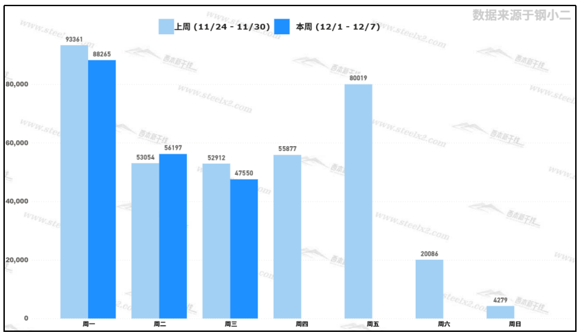 據(jù)鋼小二平臺(tái)樣本數(shù)據(jù),12月3日采樣全國(guó)工程需求量為47,550噸,環(huán)比上一個(gè)交易日下降15%。