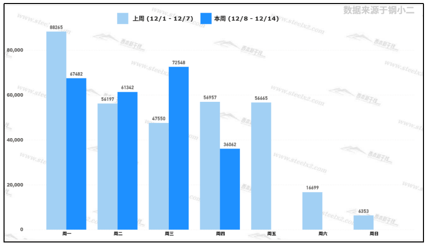 據(jù)鋼小二平臺(tái)樣本數(shù)據(jù),12月11日采樣全國(guó)工程需求量為36,062噸,環(huán)比上個(gè)交易日下降50%。