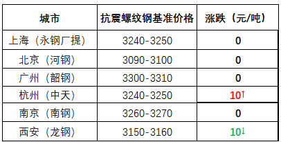截至午間,國內部分市場螺紋鋼(抗震)基價如下:上海市場3240-3250元/噸;北京市場3090-3100元/噸;廣州市場3300-3310元/噸;杭州市場3240-3250元/噸;南京市場3260-3270元/噸;西安市場3150-3160元/噸。環(huán)比來看,截至午間收盤,全國主要市場一線品牌價格多數(shù)報穩(wěn)。