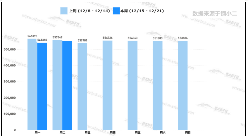 據(jù)鋼小二平臺樣本數(shù)據(jù),12月16日建筑鋼材社會庫存量為551,420噸,較昨日庫存量上升2%。