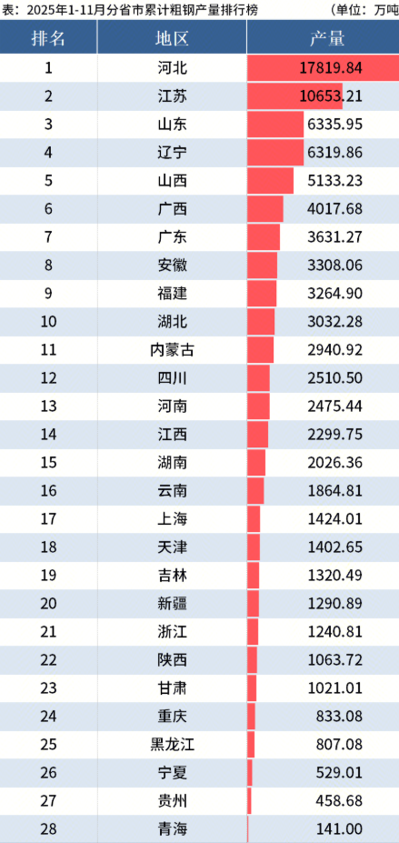 1-11月全國分省市粗鋼產(chǎn)量出爐